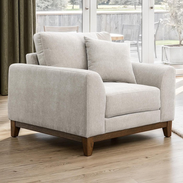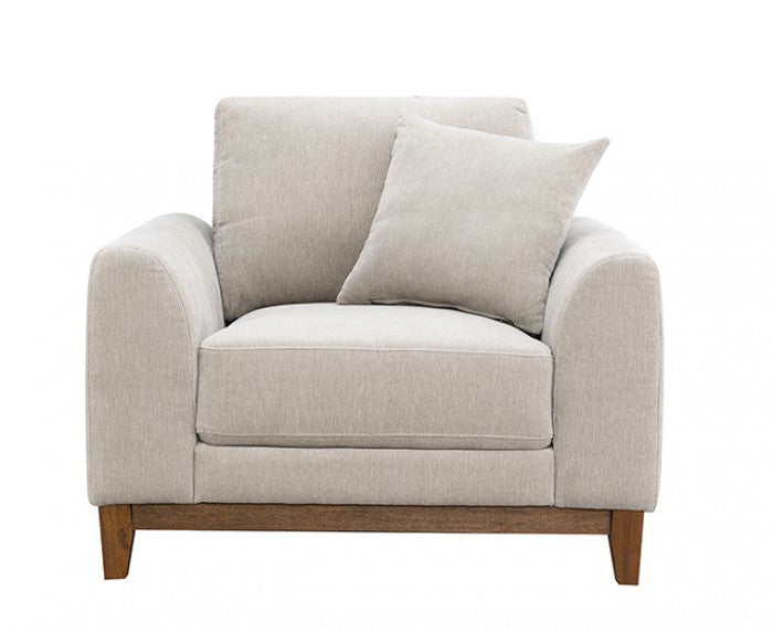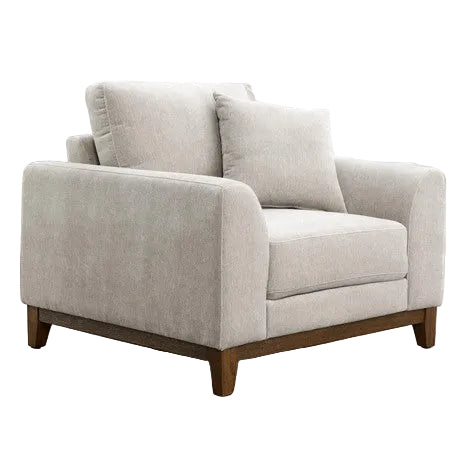 The Aaro Chair blends classic mid-century modern design with modern comfort. Its light grey chenille fabric complements warm walnut trim, soft track arms, and slightly tapered legs for a timeless silhouette. Pocket coil spring cushioning ensures comfort, while included throw pillows add a cozy and stylish touch—ideal for any architectural-inspired interior.