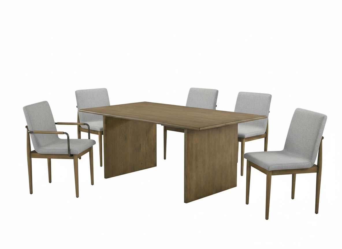 The Ansel Dining Table embodies mid-century modern simplicity with natural warmth. Its expansive tabletop is supported by wide, round-tapered legs, offering both stability and understated elegance.