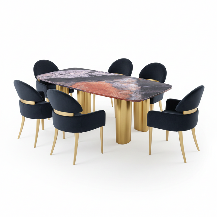 The Atlas 7-Piece Dining Set is a bold, contemporary statement defined by modern materials and architectural contrast. Combining a refined sintered stone tabletop with sculptural stainless steel legs finished in matte gold, this dining set brings elevated design to modern interiors.