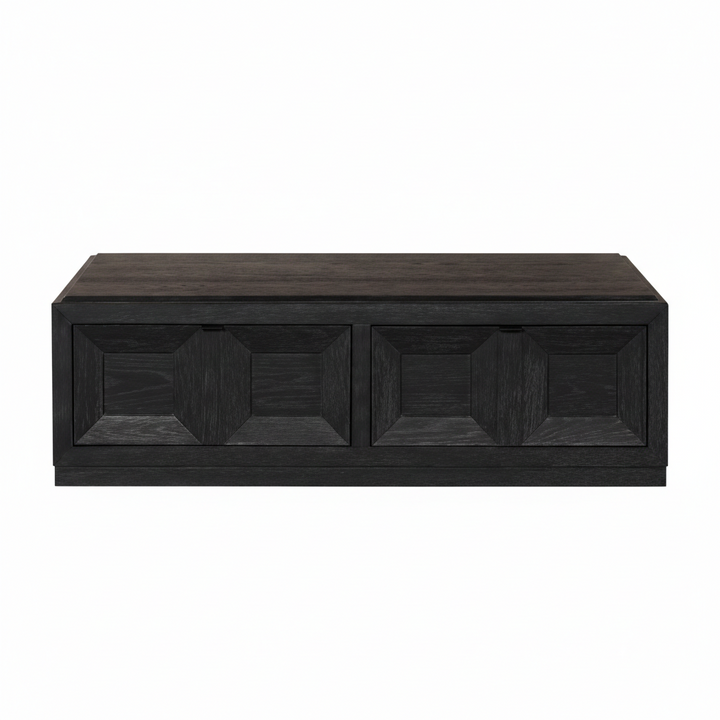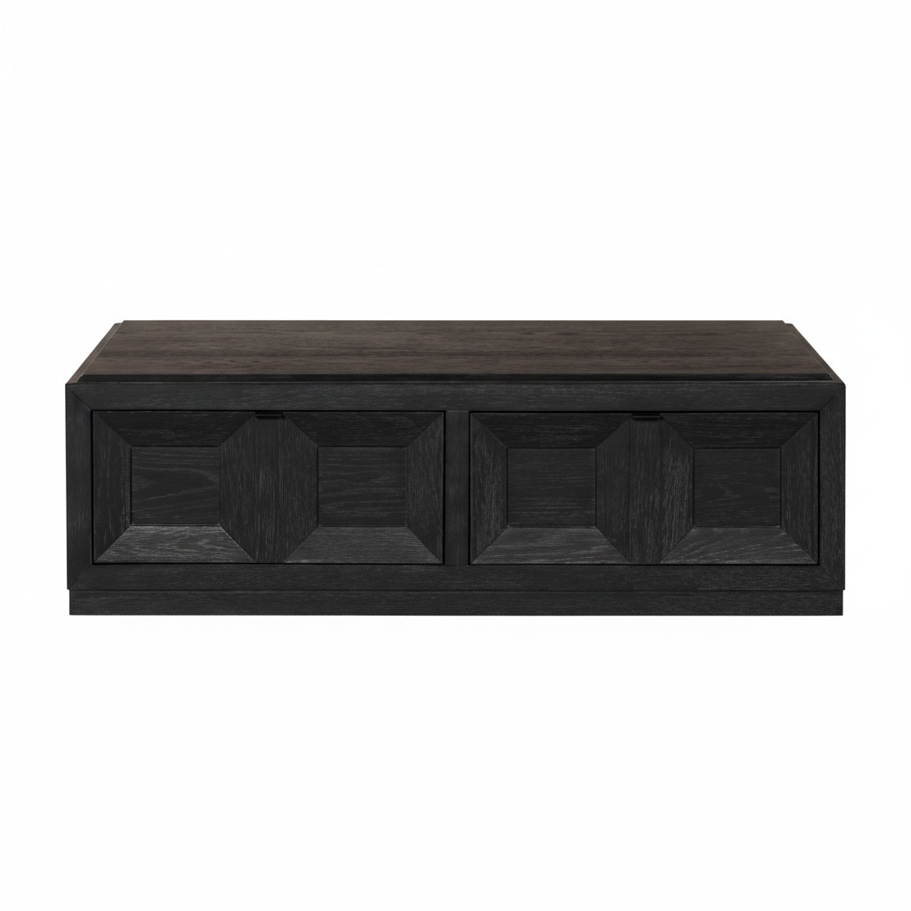 The Axis Rectangular Cocktail Table in black features ornamental sunken panels for a sophisticated modern look. Smooth ball-bearing casters ensure effortless mobility, while finger pulls provide practical access. Crafted from rubberwood, white oak veneer, and engineered wood, this piece blends durability with contemporary elegance, making it ideal for living rooms with design-forward styling.