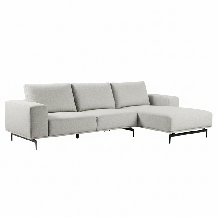 The Corel Right-Chaise Sectional in light gray wool combines modern sophistication with lasting comfort. Oversized track arms and high-density foam seat cushions provide plush support, while removable feather-blend back pillows allow flexible seating arrangements. Constructed with webbing and zigzag spring suspension, plus FSC-certified solid wood frame and metal legs, this sectional offers both durability and elegance. Certified with FSC and OEKO-TEX standards, Corel balances contemporary European design with eco-conscious craftsmanship, making it ideal for living spaces where style, comfort, and quality coexist.