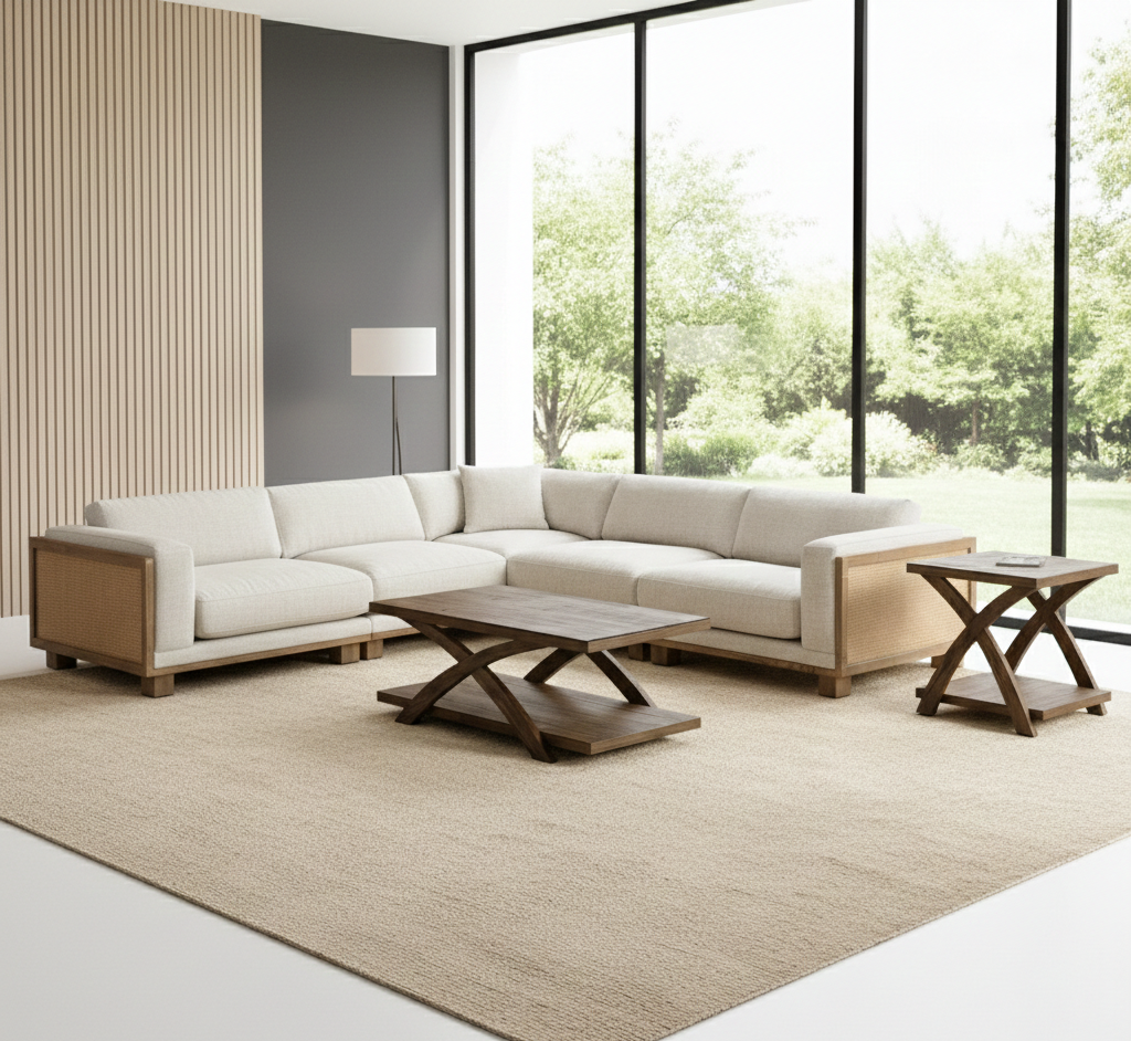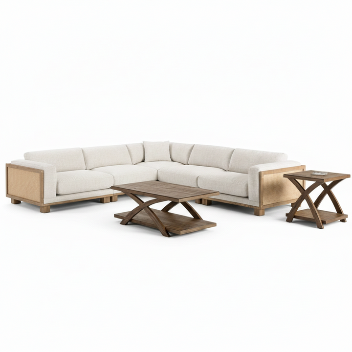 The Elda Corner Sectional invites you to unwind in style and comfort. With feather-fiber-filled reversible loose back pillows and resilient spring seat suspensions, this sectional is meticulously padded for lasting comfort. Natural ash wood trim and block wooden legs provide durable and reliable support, while rattan accents on each side introduce a subtle, organic touch. Whether curling up with a book or entertaining guests, Elda offers an elevated European-inspired aesthetic with a contemporary, approachable design. Perfect for living rooms that value both comfort and refined craftsmanship, this sectional seamlessly balances luxury and relaxation.