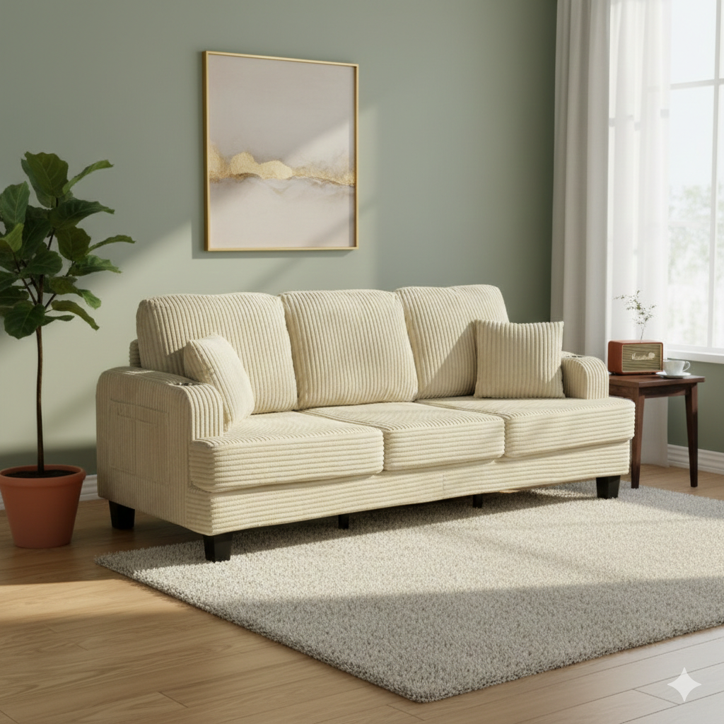 The Valleroy Sofa blends contemporary comfort with modern functionality. Upholstered in soft beige corduroy fabric, it introduces warmth and texture while maintaining a clean, versatile aesthetic suitable for everyday living spaces.