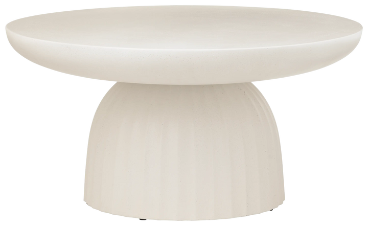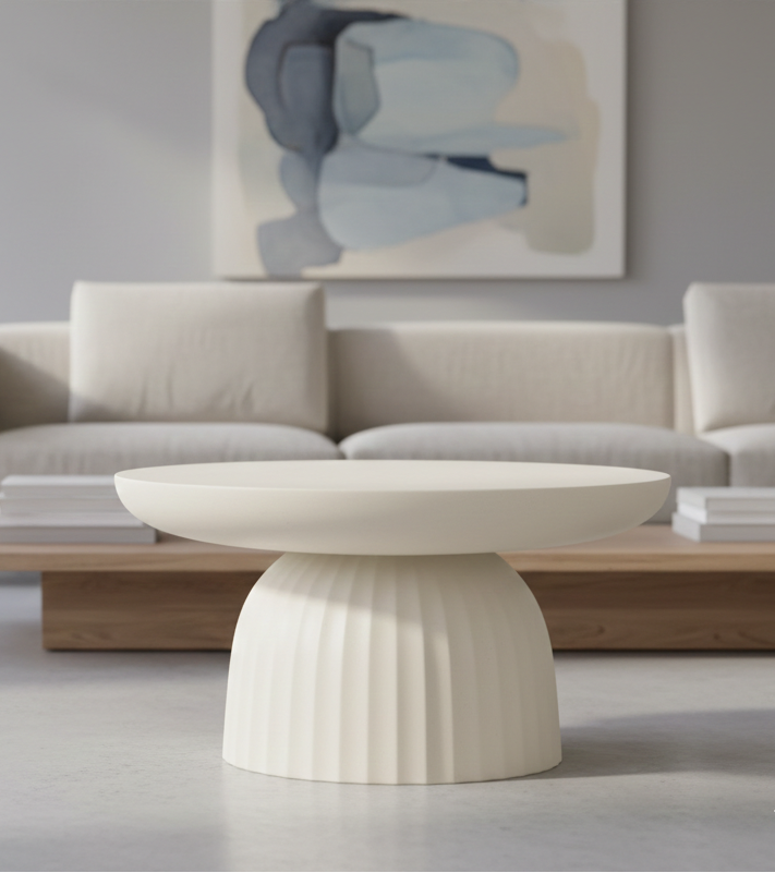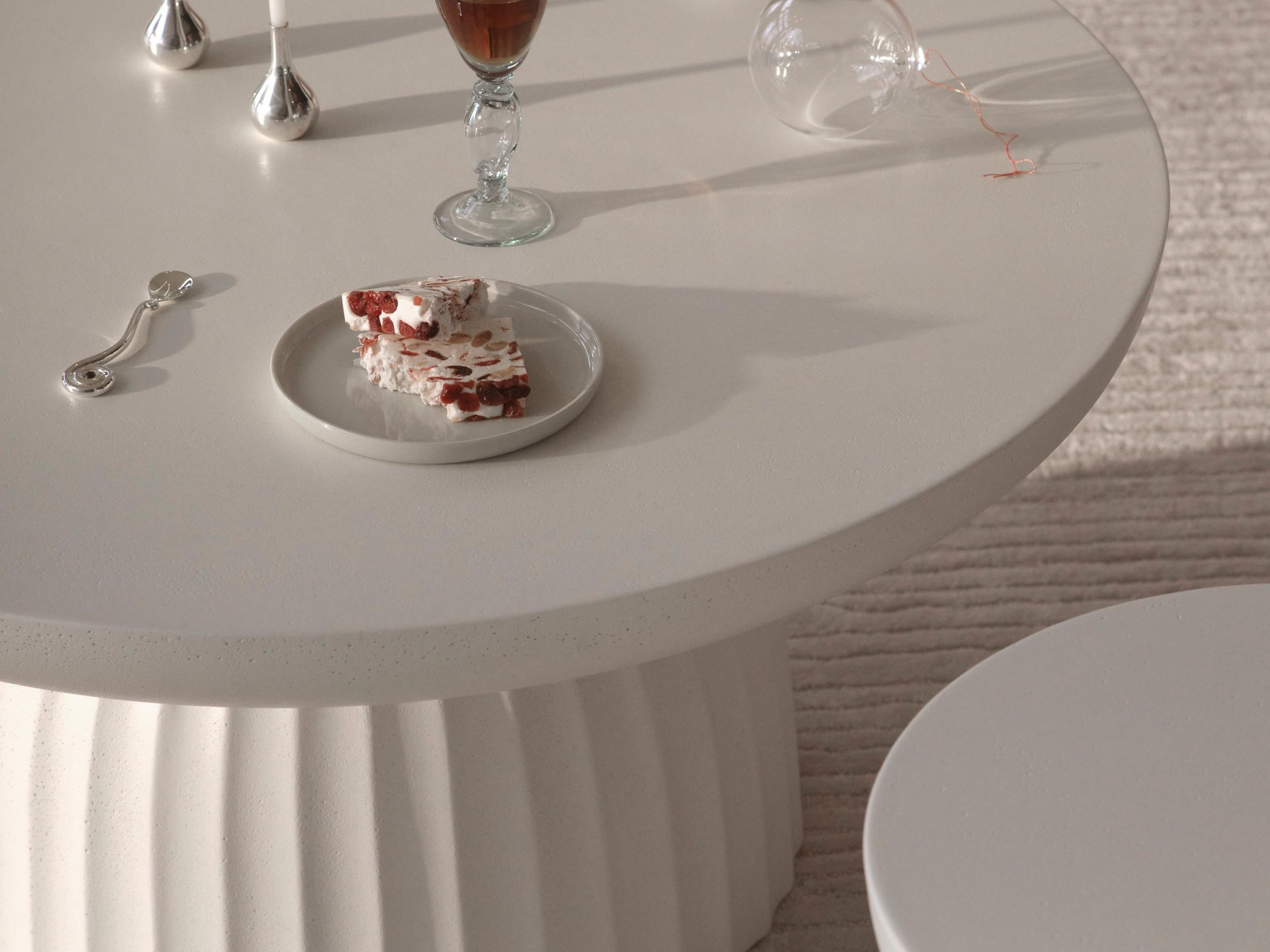 Finished in a soft ivory tone, the round tabletop and cylindrical base create a harmonious, architectural profile that anchors modern living spaces without visual clutter. The lacquered surface enhances durability while preserving the raw elegance of the concrete material.