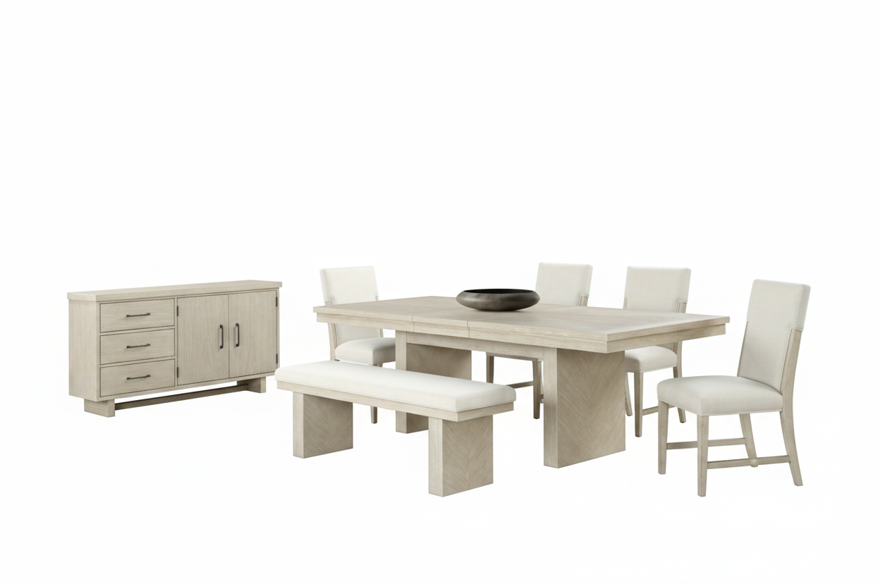 The Hygra 7-Piece Extendable Dining Set delivers a warm, modern farmhouse presence defined by natural materials, architectural massing, and practical detailing. Designed to support both everyday dining and hosting, this collection balances rustic character with clean-lined construction.