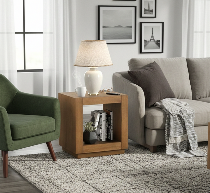 A clean plinth-style base gives the table a grounded, architectural presence, while the open bottom shelf provides convenient storage for books, baskets, or essentials—keeping surfaces uncluttered and intentional. Its square proportions allow for easy placement beside sofas, sectionals, or lounge chairs.
