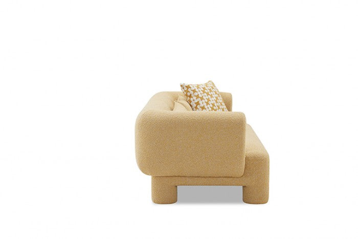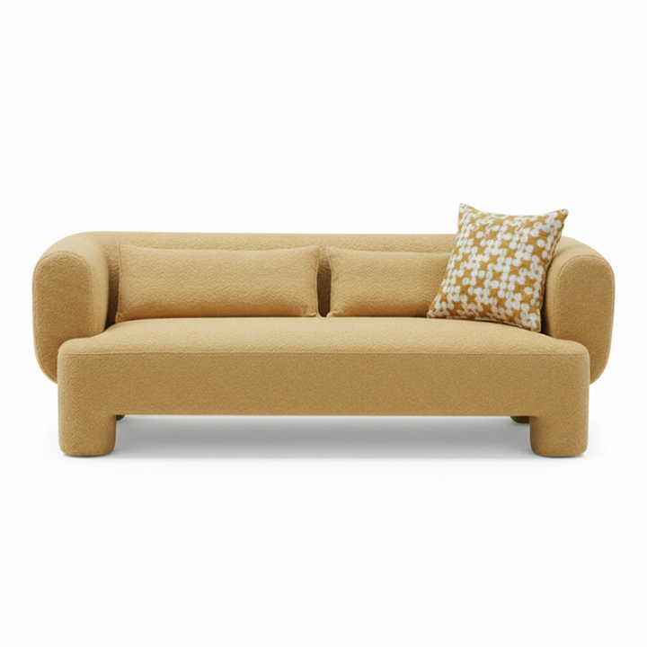 The Karsen Sofa introduces vibrant contemporary style with a focus on comfort and design. Upholstered in yellow fabric, it features a gently curved backrest complemented by oversized round arms, creating a playful yet elegant silhouette.