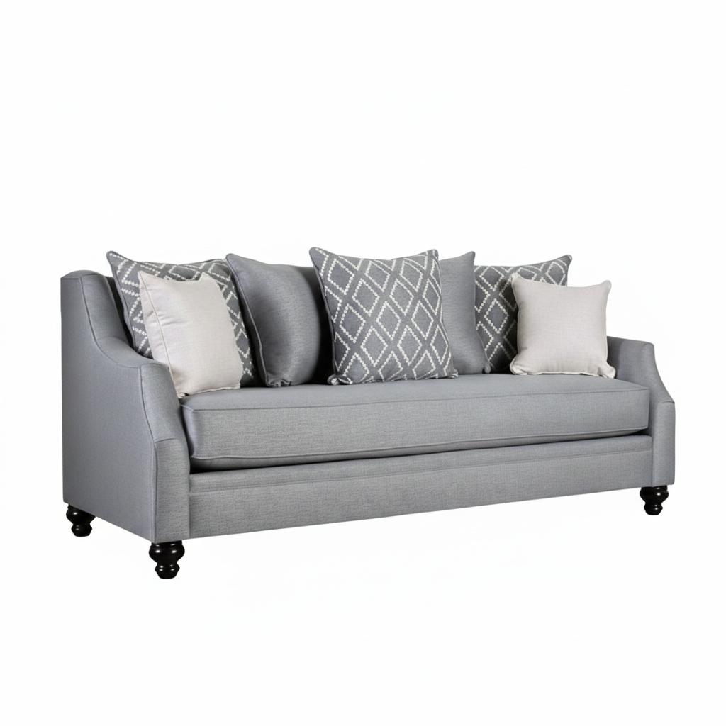 The Transitional Gray Sofa combines comfort and style to create a welcoming lounge area. Upholstered in textured gray burlap weave, it features a single-cushion seat and medium-density foam for balanced support. Sloped arms define its silhouette while tapered block legs add structural and visual interest. Included pillows enhance both comfort and aesthetic appeal, making this sofa ideal for contemporary living rooms or cozy conversation nooks.