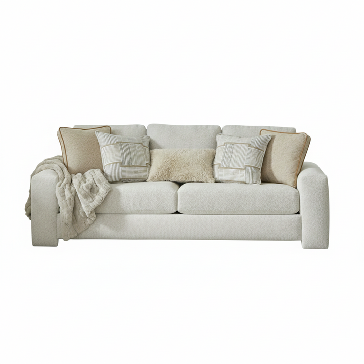 The Lysa Sofa is a warm, inviting centerpiece designed for relaxed living and contemporary comfort. Upholstered in an ultra-soft chenille fabric with subtle cream and beige tones, this sofa brings texture, softness, and understated elegance into modern interiors.