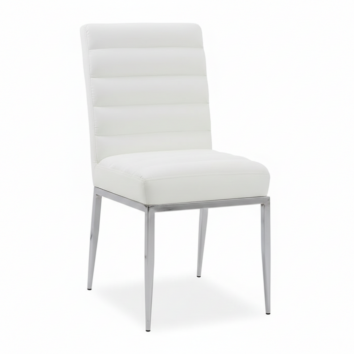 The padded seat and vertically channeled back provide structured comfort, while slim metal legs add a light, refined presence. Finished in smooth white leatherette, Enzo balances durability with a tailored appearance, making it well-suited for everyday dining and entertaining alike.