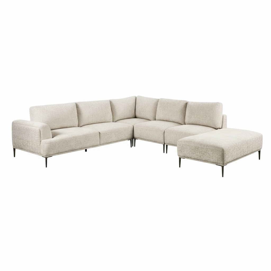 The Moden J-Shaped Sectional in light brown chenille blends modern style with spacious comfort and sustainable design. T-seat cushions paired with attached feather-blend back pillows provide plush support, while the extendable backrest and wide, deep seating offer flexibility for relaxation. Flared arms and sleek metal legs create a contemporary silhouette, complementing its soft, approachable upholstery. Crafted with FSC-certified wood and OEKO-TEX certified fabrics, Lyndon delivers premium comfort with eco-conscious craftsmanship, making it ideal for elevated, European-inspired living spaces.