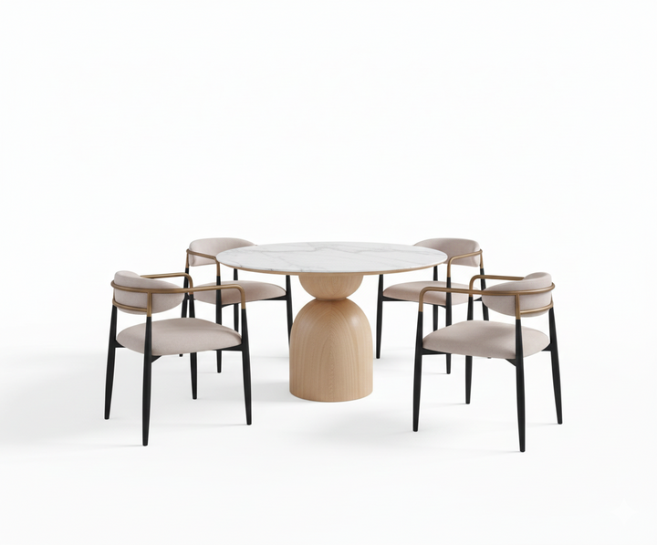 A balanced palette of natural tones, black framing, and white upholstery is enhanced by subtle gold accents, creating a sophisticated yet approachable dining silhouette. The mixed-material construction adds visual depth, making Orvik an ideal companion for modern and upscale dining environments.