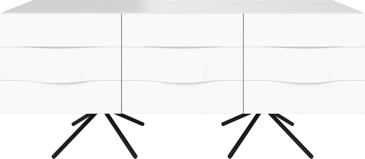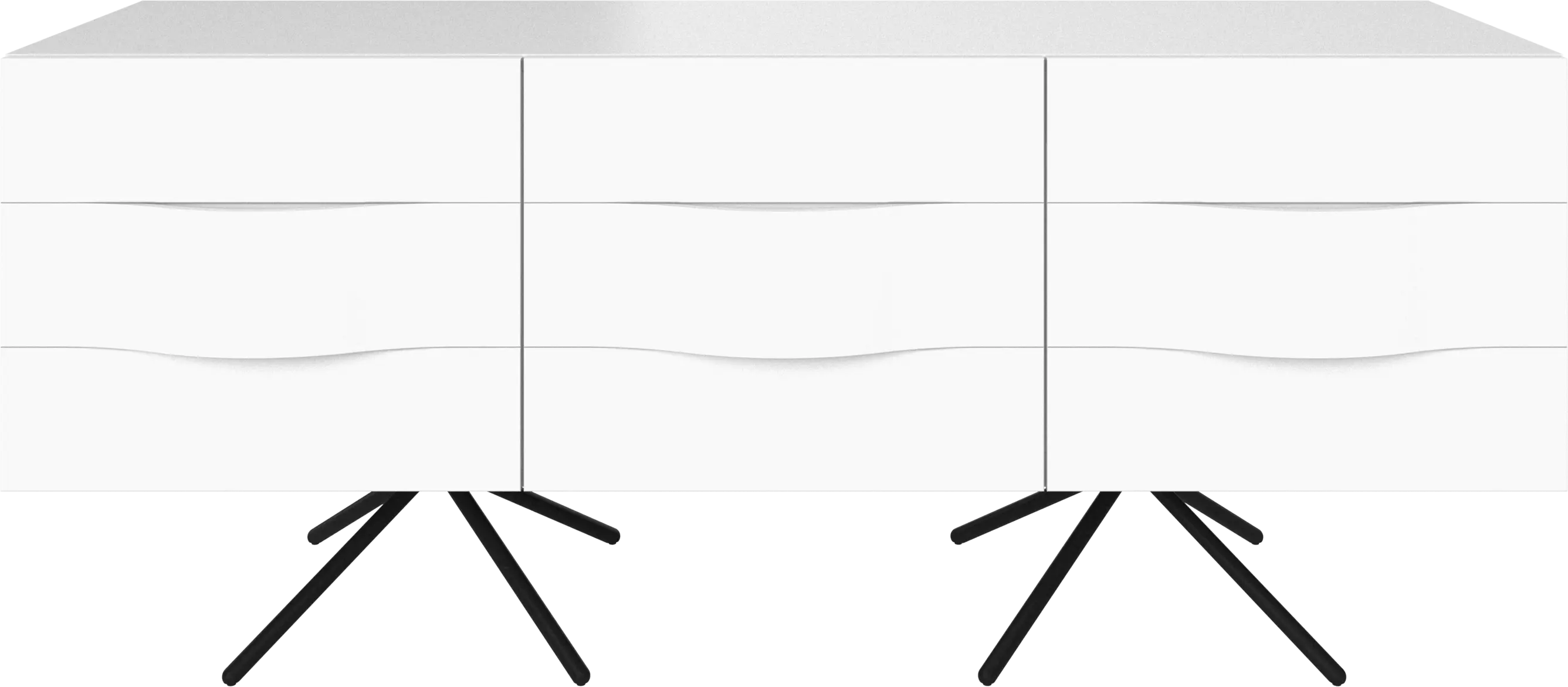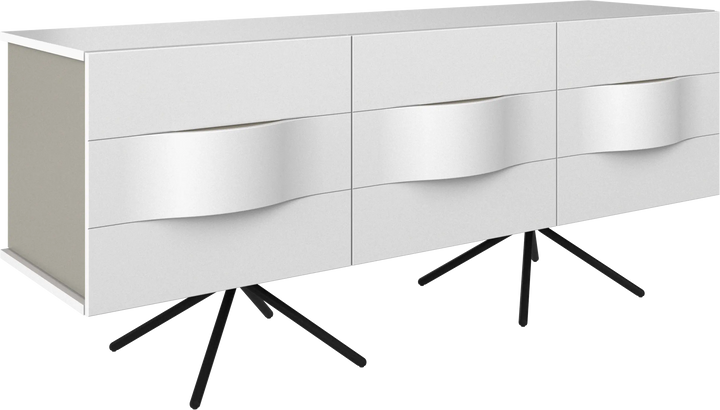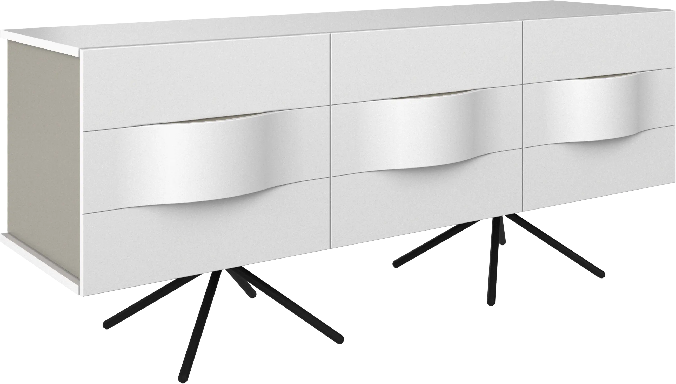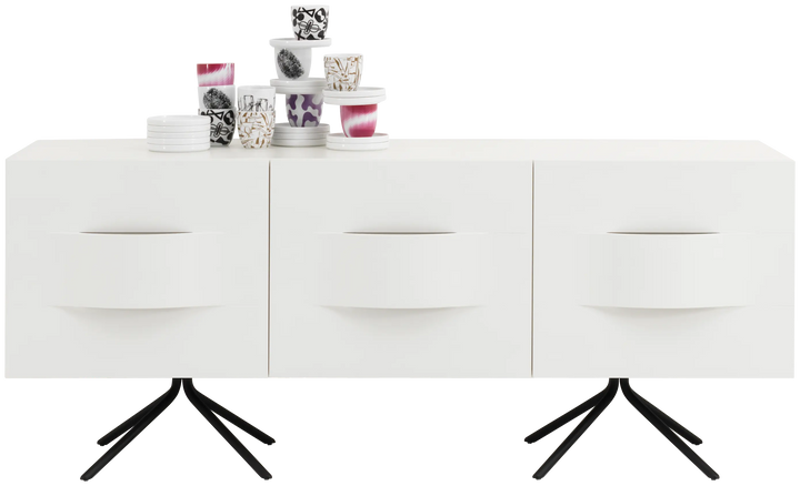 Finished in a sleek matte white lacquer, the Ottawa sideboard delivers a clean, sophisticated aesthetic that feels both timeless and forward-thinking. The piece is elevated by a matte black, powder-coated base, creating a striking contrast that enhances its graphic silhouette.