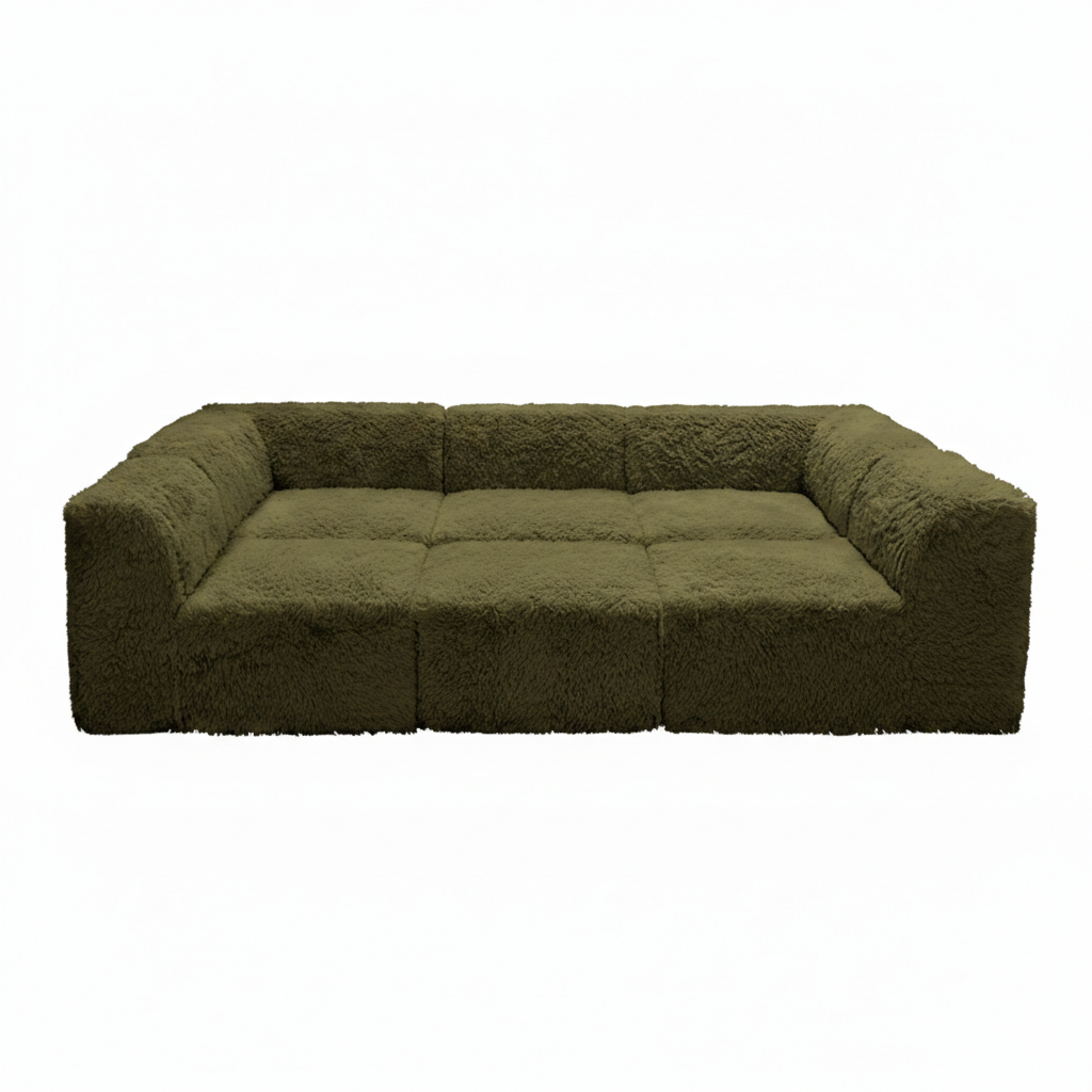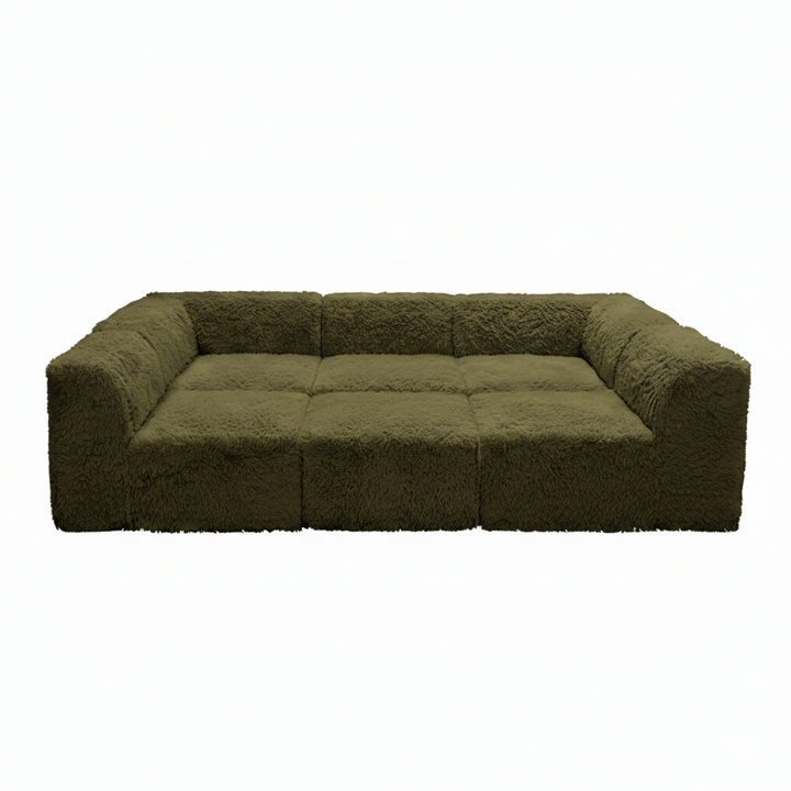 The Riff Daybed merges contemporary design with inviting comfort. Upholstered in soft olive green faux fur, it offers deep seating ideal for lounging, reading, or relaxed social gatherings.