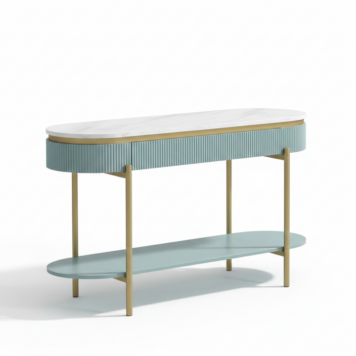 The sia Coffee Table in light teal channels Hollywood glamour with contemporary functionality. Its white faux marble top is supported by matte gold steel legs, while curved reeded side panels add texture and conceal a storage drawer. An open bottom shelf adds display space, combining elegance with practicality. Ball-bearing glides ensure smooth operation of the drawer.