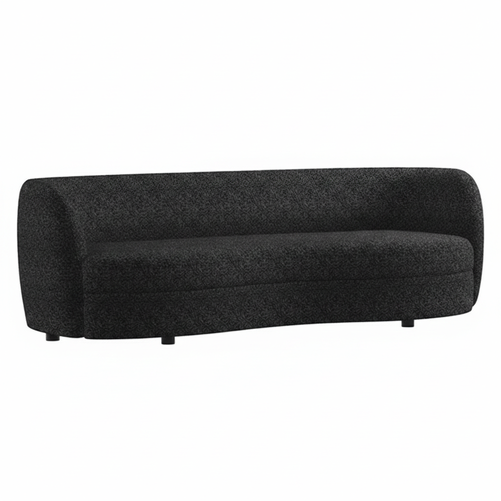 Upholstered in exclusive black bouclé fabric with subtle metallic undertones, the sofa adds texture and shimmer under ambient lighting, making it a chic focal point in any room. The barely-there wooden legs emphasize the floating, lightweight aesthetic, while the high-density foam with pocket coil support ensures durable comfort.