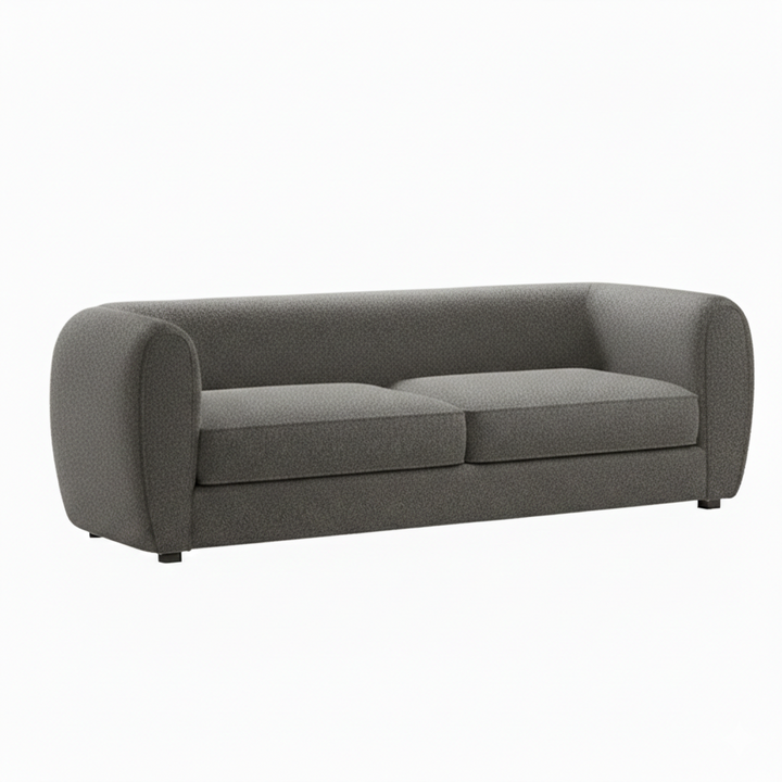 Curved arms and a continuous tuxedo-inspired backrest create a seamless, enveloping form that feels both intentional and inviting. Upholstered in exclusive charcoal bouclé fabric with subtle metallic undertones, the surface texture interacts beautifully with light—offering a soft shimmer that elevates neutral interiors with quiet sophistication.