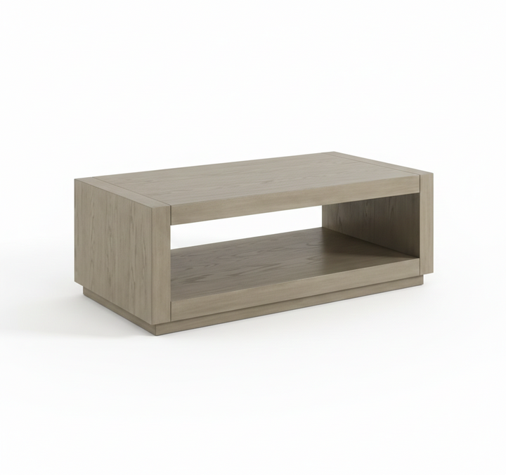The Solen Coffee Table brings understated elegance to any contemporary living space. Crafted from natural oak veneer with a solid rubberwood base, the table features an open bottom shelf for practical storage and display. Its minimal plinth base design enhances stability while maintaining a sleek, modern aesthetic.