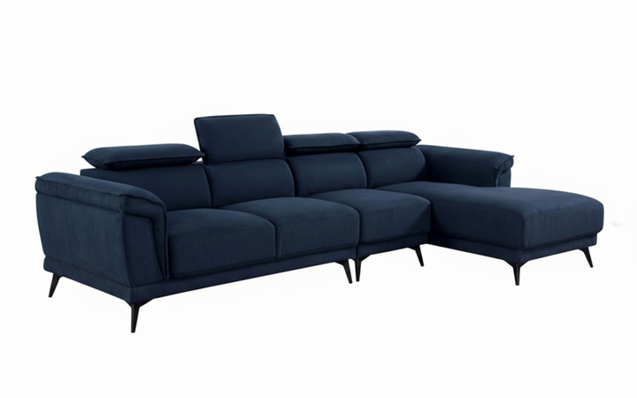 The Sona Sectional combines contemporary design with plush comfort for modern living spaces. Upholstered in rich navy fabric, it features an end chaise for extended lounging, making it ideal for both relaxation and entertaining.