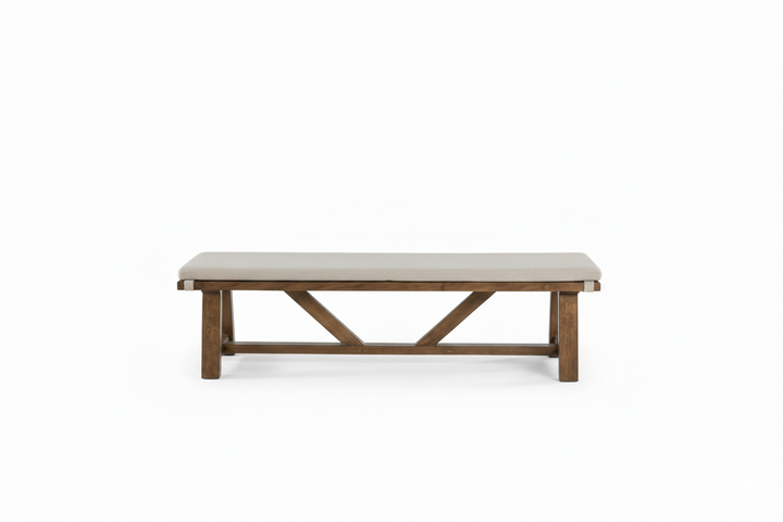 Crafted from solid wood with wood veneer accents, the trestle-base construction provides visual strength and long-lasting stability. The upholstered seat cushion in soft white fabric adds comfort and contrast, making the bench suitable for extended meals and casual gatherings alike.