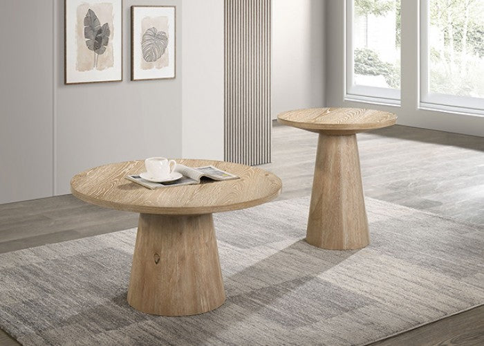 The Tervik Cocktail Table in natural oak offers a sleek, modern addition to any living space. Crafted from solid rubberwood and oak veneer, the table features a cone-shaped pedestal base that combines stability with contemporary style. The minimalist design ensures versatility in both formal and casual interiors, providing a practical and stylish tabletop for décor, drinks, and everyday use.