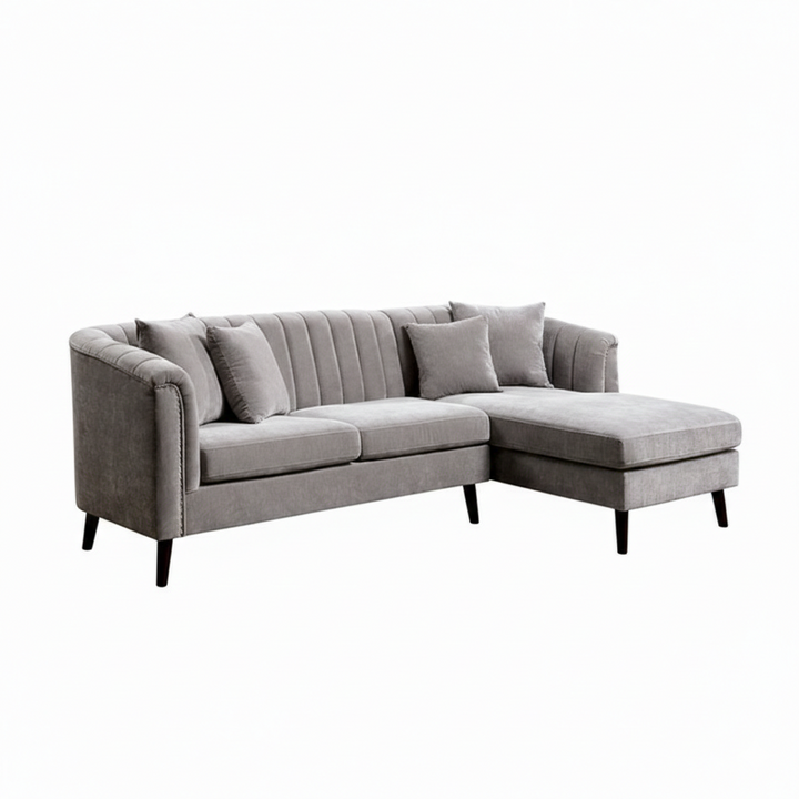 The Viggo Sectional in mid-century modern style blends classic Chesterfield charm with contemporary sectional functionality. Wrap-around arms and button-tufted channel detailing evoke mid-century elegance, while the L-shaped design—with an extended chaise—offers both comfort and versatility for modern living spaces.
