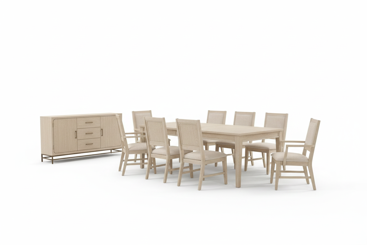 The Sova 7-Piece Extendable Dining Set offers a calm, transitional interpretation of modern dining, pairing warm light oak tones with soft upholstery and flexible functionality. Designed for both everyday meals and hosting, this collection balances visual warmth with clean, practical construction.