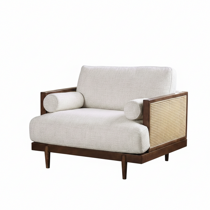 Ash wood trims and woven rattan panels introduce organic textures, adding warmth and visual interest. The beige fabric upholstery provides a neutral base that complements a wide variety of interior palettes. Feather fiber pillow filling enhances support and comfort, creating a sophisticated seating experience that blends form and function seamlessly.