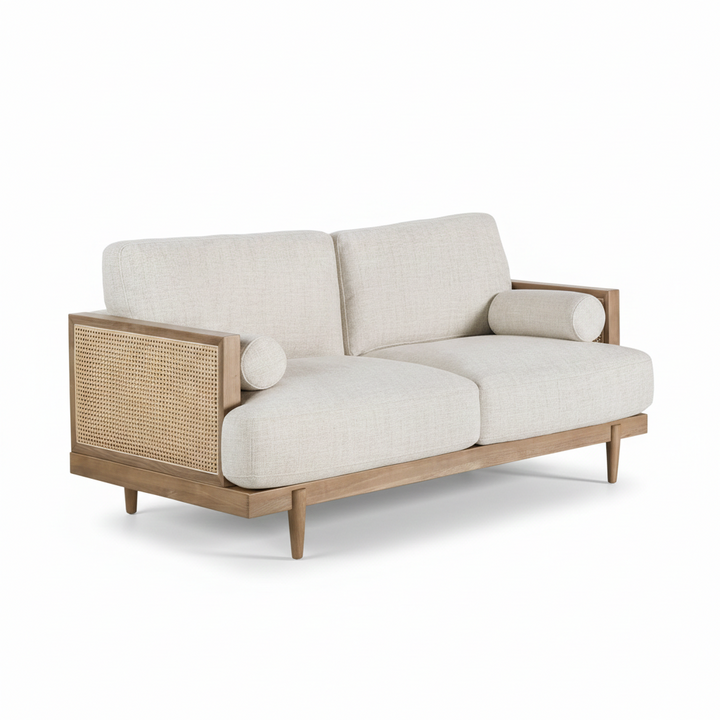The Mid-Century Modern Loveseat offers a refined blend of retro charm and contemporary comfort, ideal for intimate living spaces. Beige fabric upholstery adds warmth, while ash wood trims and woven rattan panels introduce natural texture. Reversible loose back and side bolster pillows, paired with plush seat cushions, create a harmonious balance between softness and structure. Tapered wooden legs and webbing seat suspension enhance both durability and mid-century aesthetic, making this loveseat a versatile and stylish addition to any living room.