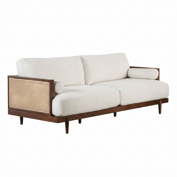 The Mid-Century Modern Sofa blends retro charm with contemporary comfort, creating a sophisticated centerpiece for any living room. Beige fabric upholstery brings warmth, while ash wood trims and woven rattan panels add natural texture and elegance. Loose back and side bolster pillows paired with plush seat cushions strike the perfect balance between softness and structure. Tapered wooden legs and webbing seat suspension enhance both style and durability, making this sofa a timeless addition to curated interiors.